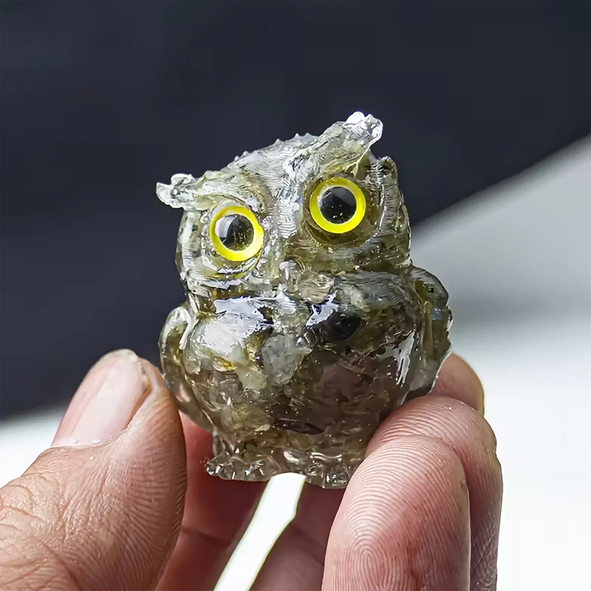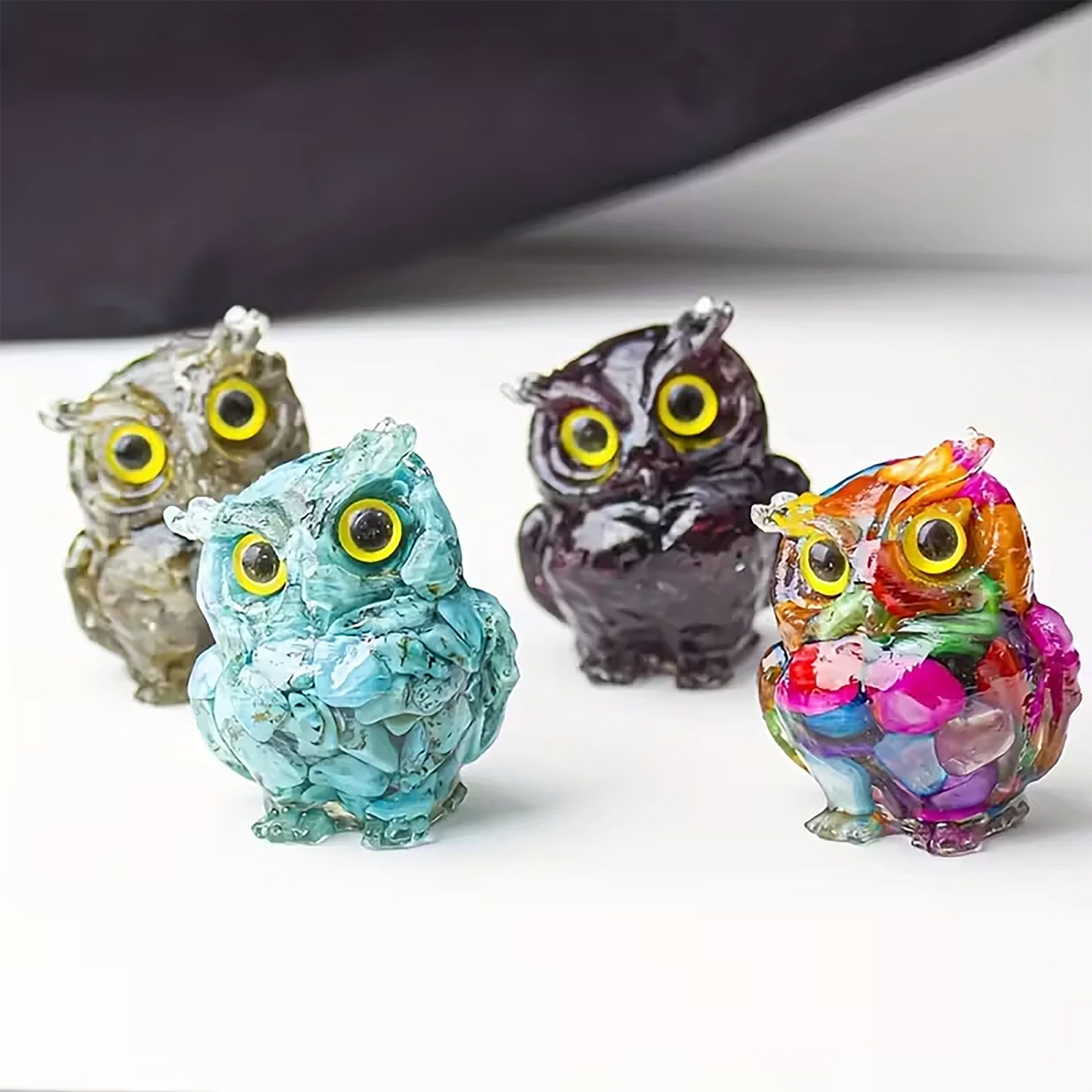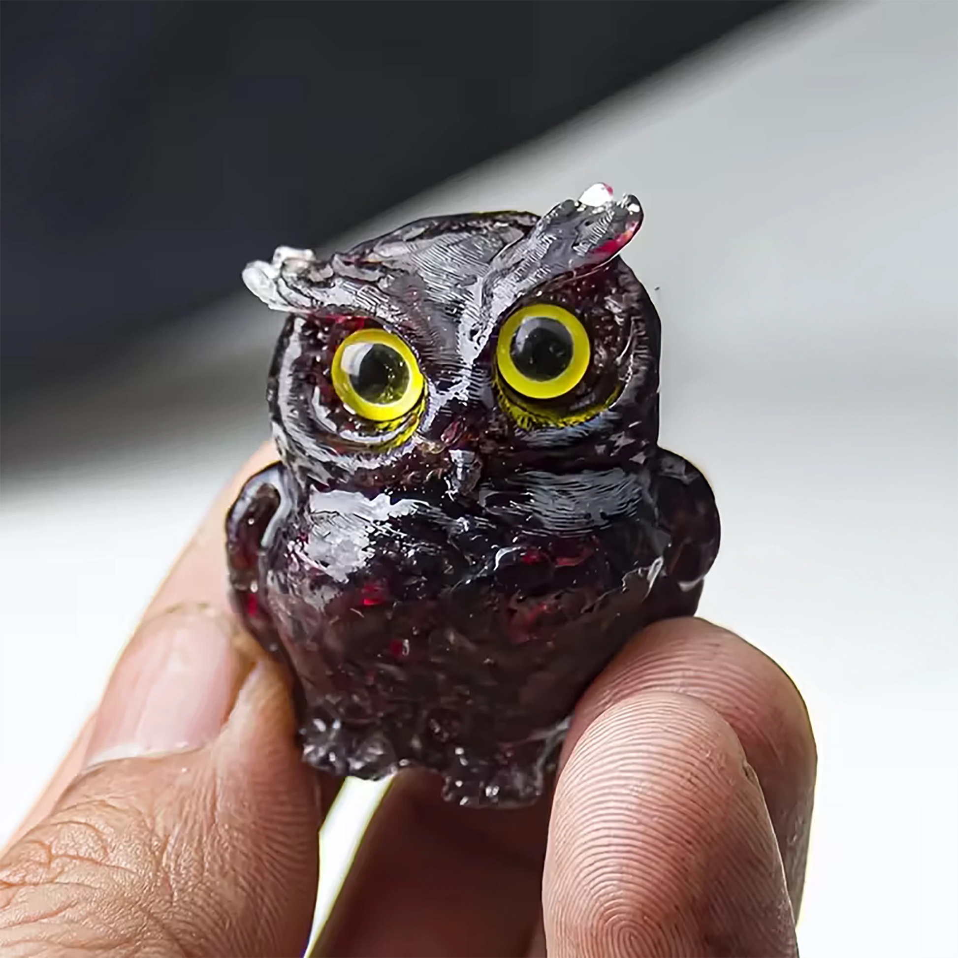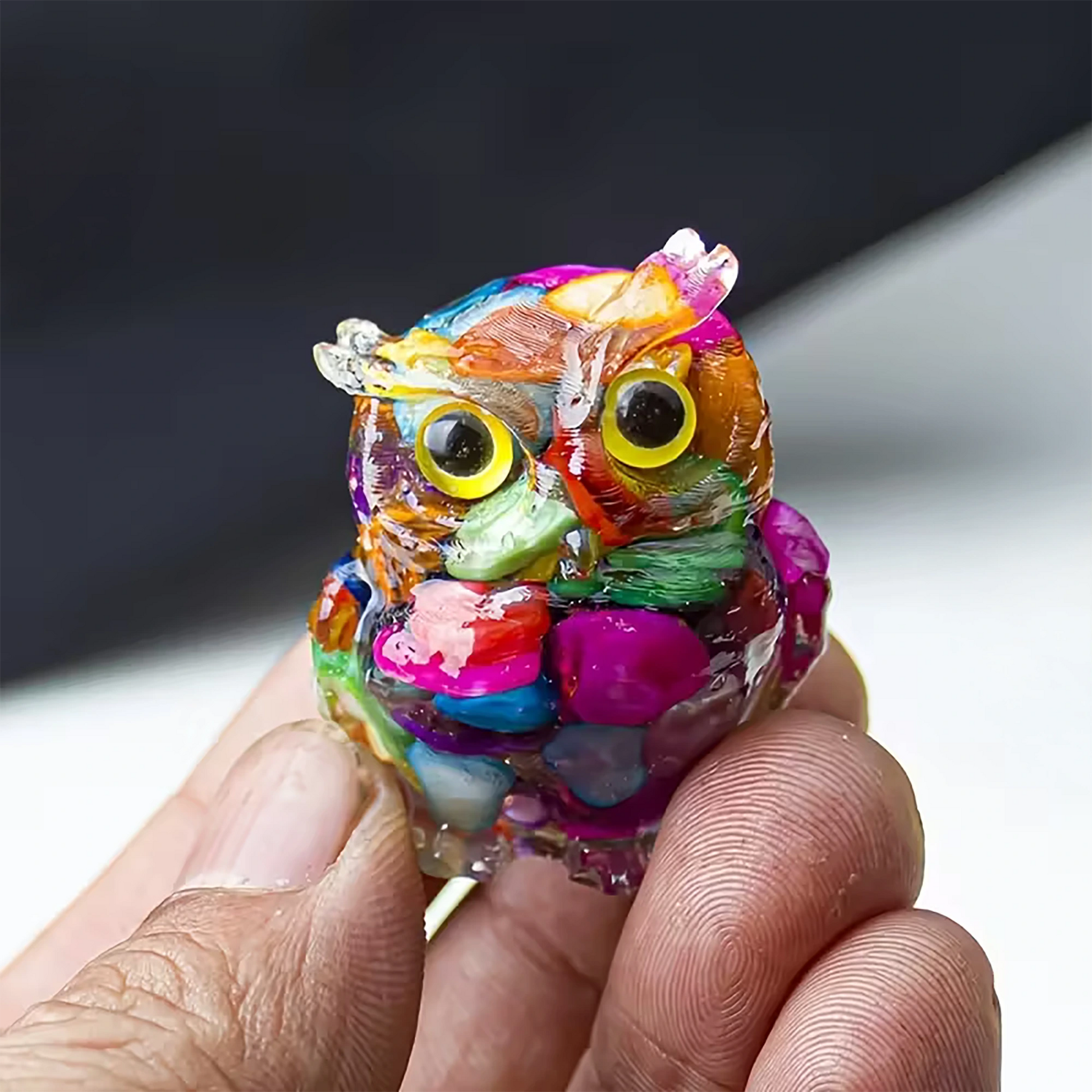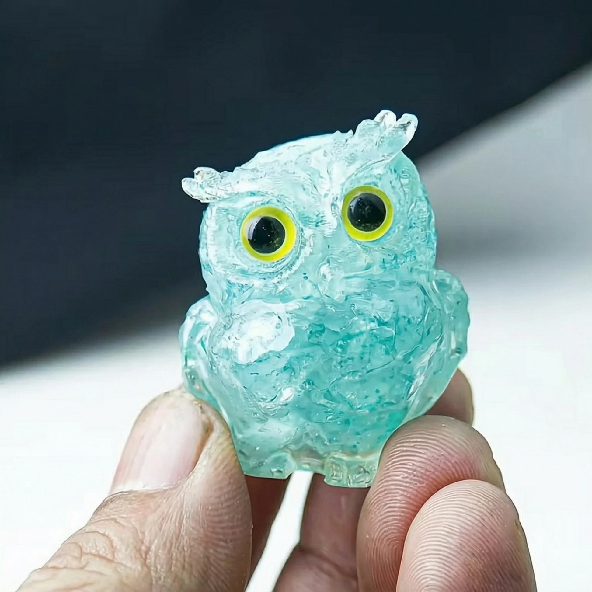 Eine kleine Eule aus schimmerndem Kunstharz, die wie ein echter Edelstein funkelt und jedem Raum einen Hauch von Magie verleiht. Wählen Sie zwischen Granat, Labradorit, Perlmutt oder Aquamarin.