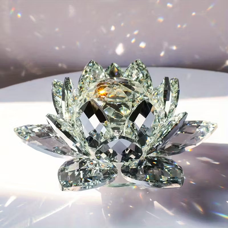 Eine Blüte, die nie verblüht. Die Kristallblüte fängt das Licht ein und wirft funkelnde Reflexe in den Raum – ein kleines Kunstwerk aus geschliffenem Glas. Ob auf dem Schreibtisch, im Regal oder auf der Fensterbank: Diese Lotusblume bringt Ruhe und Eleganz in jeden Raum.